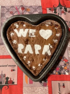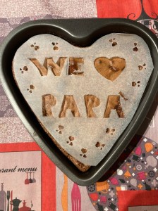 Ho disegnato la scritta WE LOVE PAPA’ sulla carta forno con una matita, ho poi ritagliato le lettere con il taglierino e ho creato la mascherina per lo zucchero a velo, per questa torta ho deciso di utilizzare una teglia a forma di cuore.