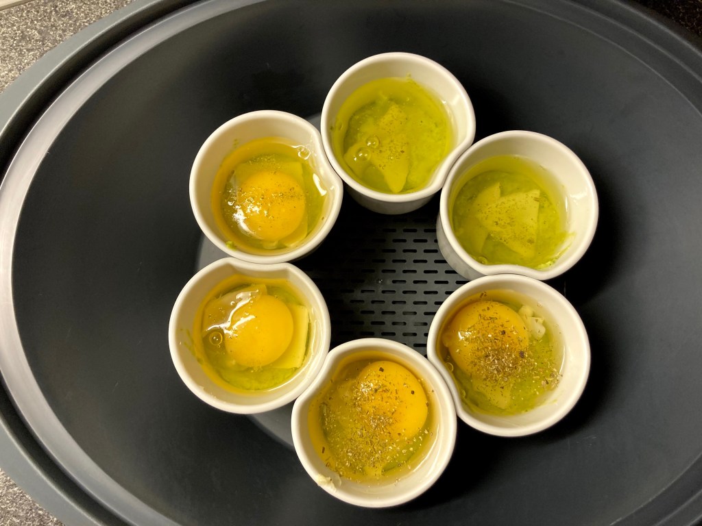 Mio marito al compleanno mi ha regalato le fantastiche cocottine in ceramica per Varoma firmate Vorwerk e non vedevo l’ora di provarle, ho pensato che la Pasqua fosse l’occasione giusta per testarle e il risultato è stato davvero molto positivo. in fondo all’articolo vi metto il link della ricetta che ho trovato in Cookidoo con fave e piselli, è molto interessante e anche i vostri bambini ne andranno matti. Qui sotto vi metto le foto della mia versione fatta con un fondo di pesto di zucchine, pistacchi e basilico, le cocottine sono 6 ma io avevo 4 uova intere e due albumi, quindi ho provato a farne due solo con albume. Prima di mettere le uova ho aggiunto del formaggio dolce a fette che ci sta davvero bene. Il principio è comunque quello di mettere sul fondo delle cocottine una salsa e poi rompere un uovo intero in ciascuna cocottina e condire l’uovo da crudo con sale aromatico, pepe e erba cipollina. Il mio consiglio è quello di controllare il livello di cottura dell’uovo in modo da raggiungere quello desiderato.