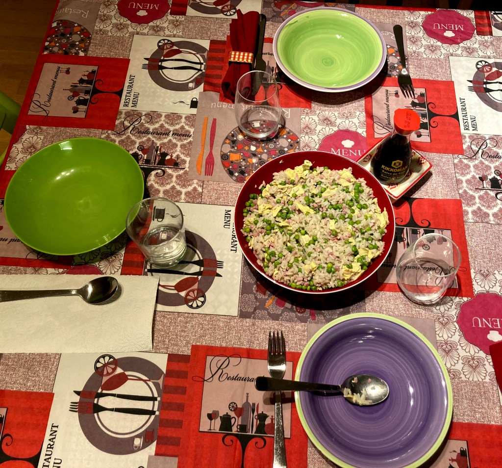 Preparazione: versare l’acqua nel boccale, aggiungere lo zenzero e posizionare il cestello, scaldare 9 min 100° vel 1. Nel frattempo sistemare i piselli e il prosciutto nella campana del Varoma. Foderare il vassoio del Varoma con carta forno bagnata e ben strizzata e versarvi le tre uova sbattute salate. A bollitura raggiunta, versare il riso nel cestello, chiudere il coperchio, posizionare il Varoma e cuocere 16 min temperatura Varoma vel 4. a cottura ultimata mettere in una ciotola il riso, i piselli e il prosciutto. Tagliare a quadretti la frittata e unirla al resto. Condire con la salsa di soia o olio a piacere. Buon appetito.