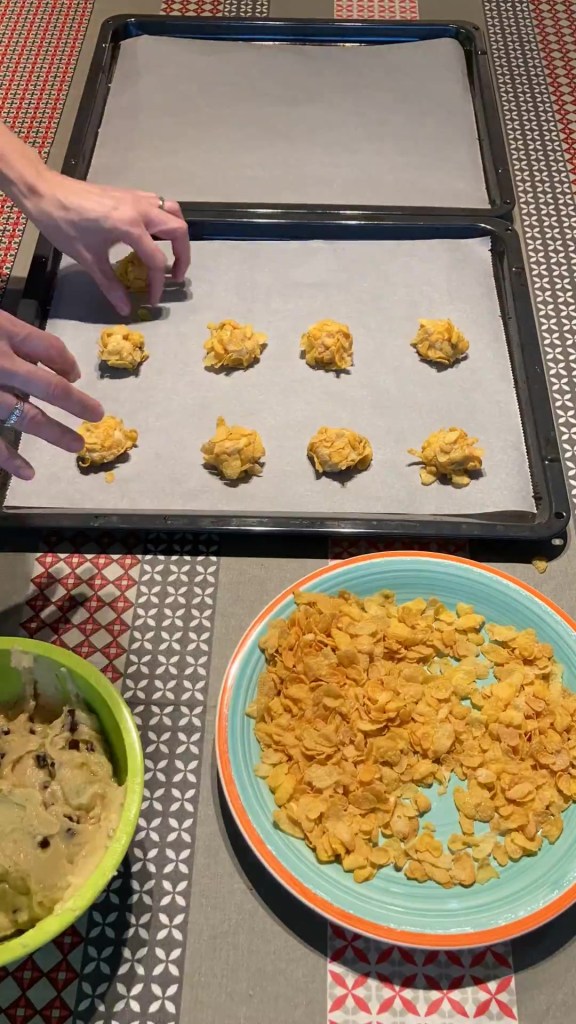 Procedimento: preriscaldare il forno a 180°C. Rivestire la teglia con carta forno. Mettere nel boccale lo zucchero e le uova, montare: 1 min./vel. 3. Aggiungere la farina, il burro, il lievito e mescolare: 1 min./vel. 6. Aggiungere le gocce di cioccolato e amalgamare: 10 sec./vel. 4. Con il composto formare delle palline e passarle nei fiocchi di mais. Disporre le palline sulla placca del forno preparata in precedenza e cuocere in forno caldo per 15-20 minuti (180°C). Sfornare, lasciare intiepidire e a piacere spolverare di zucchero a velo.