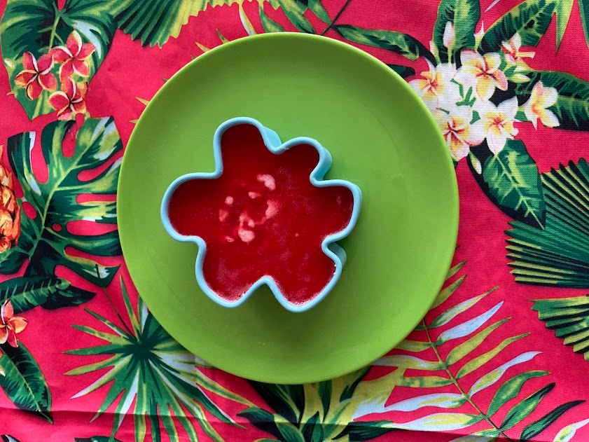 Togliere lo stampo dal frigorifero e trasferire il composto ottenuto nello stampo, avremo così formato il secondo strato bianco. Raffreddare in frigorifero fino a quando il ripieno non si è stabilizzato (circa 1 ora). Lavare e asciugare il boccale e preparare la marmellata gelè. Mettere i lamponi lavati e asciugati, il succo di limone, la gelatina (precedentemente ammollata in acqua e ben strizzata), lo zucchero e la restante acqua (50 gr) nel boccale e scaldare 3 minuti/80°C/velocità 2. Se volete potete filtrare il composto con un colino per togliere i semini dei lamponi.