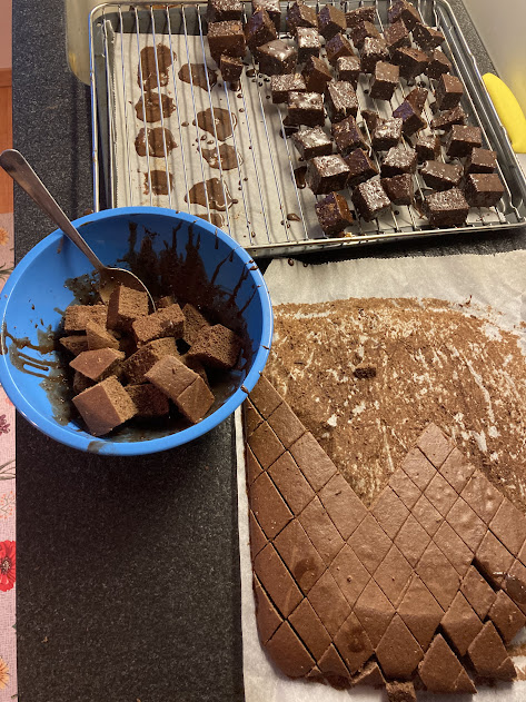 Ingredienti glassatura e fine della ricetta: 250 g di zucchero, 100 g di cioccolato al latte, 25 g di burro, 100 g di acqua, 50 g di cioccolato in polvere. Preparazione: mettere lo zucchero nel boccale e frullare per 30 sec. a velocità 10. Aggiungere il cioccolato al latte e tritare di nuovo per 20 secondi / velocità 8. Aggiungere i restanti ingredienti della glassa e farli sciogliere per 2 minuti /50°/ velocità 2. Tagliare a pezzetti il pane cotto al forno e metterlo in una ciotola grande. Versare la glassa e disporre i pezzi singolarmente su una gratella per farli asciugare.