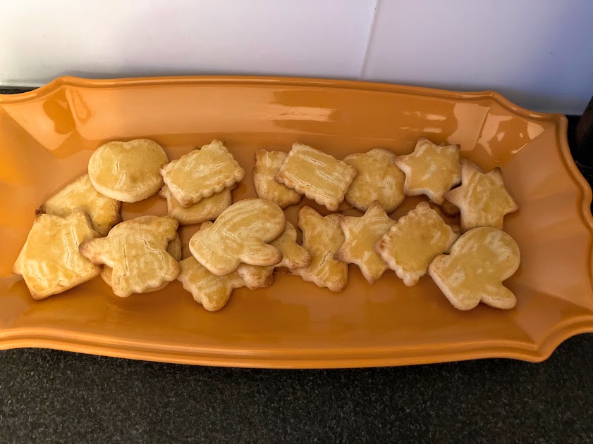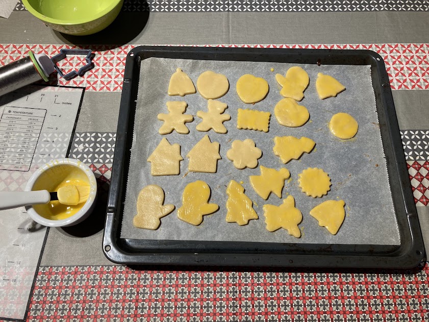 Preriscaldare il forno a 200°C e rivestire una placca da forno con carta da forno. Su una superficie leggermente infarinata stendere l’impasto con il mattarello formando una sfoglia di 6-8 mm, ricavare diversi milanesini con l’aiuto degli stampini per biscotti e trasferirli sulla placca da forno precedentemente preparata. Spennellare i milanesini con il tuorlo e cuocere in forno per 8-10 minuti (200°C).