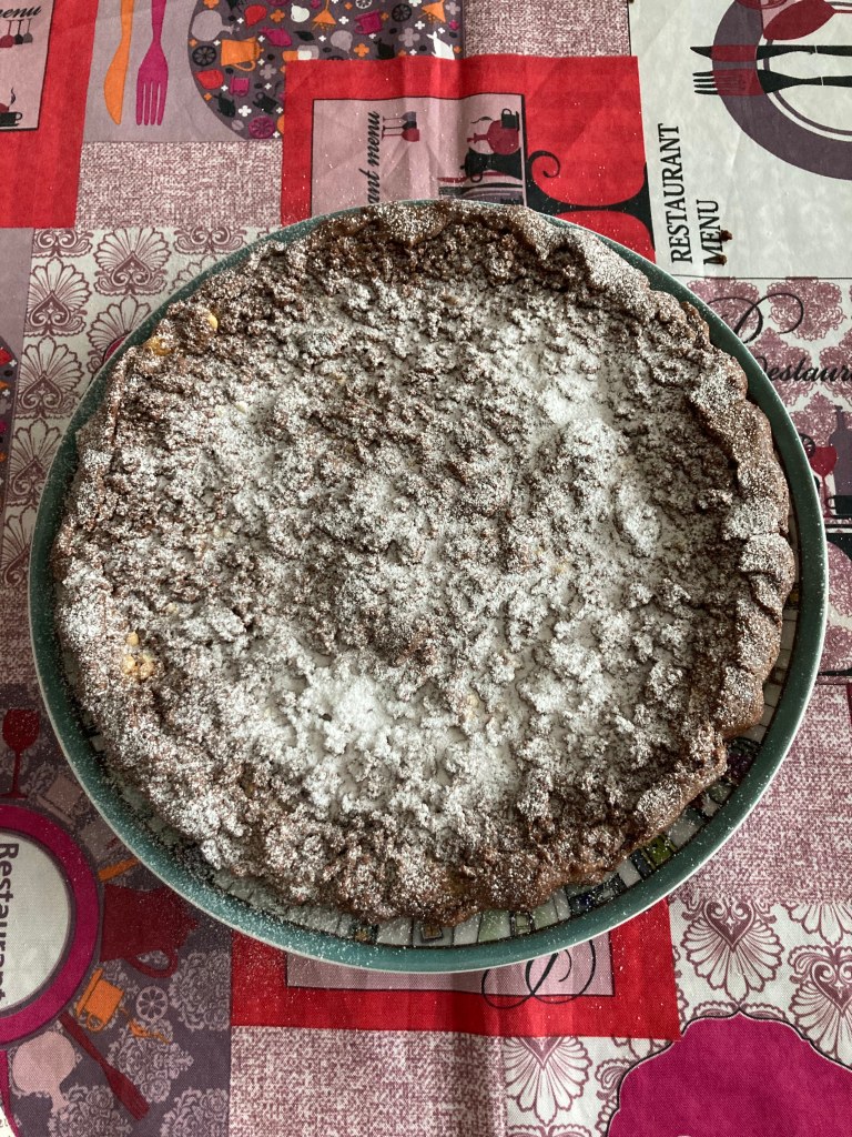 Questa ricetta mi piace molto nella versione originale, ma insieme a mia figlia Arianna ci siamo inventate questa variante che ci ha davvero conquistate, avete presente i biscotti al cioccolato GRISBI con la cremina bianca dentro? Ecco il sapore di questa versione della torta della nonna ricorda proprio questi golosi biscotti. Abbiamo preparato una crema Thermomix® alle nocciole e mandorle e poi abbiamo seguito la ricetta della torta della nonna originale, mettendo nell’impasto 30 gr di cacao amaro in polvere (al posto di 30 gr di farina). Infine vi do un consiglio pratico, soprattutto se fate questa torta con i bambini: la parte di impasto (1/3) che dovete usare per la copertura della torta, potete metterla di nuovo nel Thermomix® e tritarla 5 sec vel. 5 e metterla sbriciolata a coprire tutta la crema, il risultato, come vedere dalle foto è più rustico.