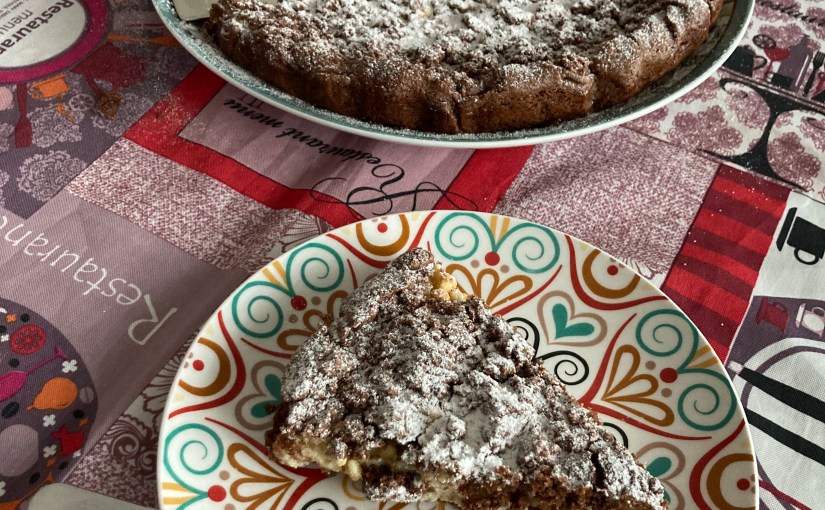 Questa ricetta mi piace molto nella versione originale, ma insieme a mia figlia Arianna ci siamo inventate questa variante che ci ha davvero conquistate, avete presente i biscotti al cioccolato GRISBI con la cremina bianca dentro? Ecco il sapore di questa versione della torta della nonna ricorda proprio questi golosi biscotti. Abbiamo preparato una crema Thermomix® alle nocciole e mandorle e poi abbiamo seguito la ricetta della torta della nonna originale, mettendo nell’impasto 30 gr di cacao amaro in polvere (al posto di 30 gr di farina). Infine vi do un consiglio pratico, soprattutto se fate questa torta con i bambini: la parte di impasto (1/3) che dovete usare per la copertura della torta, potete metterla di nuovo nel Thermomix® e tritarla 5 sec vel. 5 e metterla sbriciolata a coprire tutta la crema, il risultato, come vedere dalle foto è più rustico.