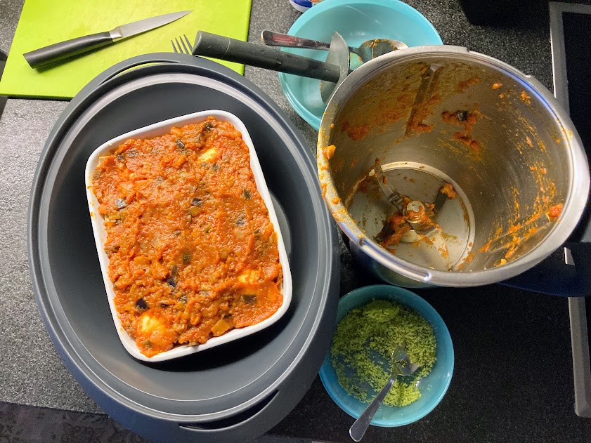 Tanti clienti mi dicono che non utilizzano il Varoma, anzi non sanno neppure dove lo hanno messo in cucina, allora cerco sempre di dare consigli e trucchi per utilizzare al meglio questa preziosa parte del nostro Thermomix®. Io utilizzo molto il Varoma per ogni tipo di preparazione e quando trovo qualche utilizzo “insolito”, lo voglio subito sperimentare e sono sempre davvero sorpresa per tutte le qualità che hanno i piatti cucinati a vapore: colori, vitamine, gusto, cottura uniforme e leggerezza. Questa volta ho trovato una ricetta delle lasagne da preparare all’interno del boccale, con la ricotta al posto della besciamella e con un ragù di melanzane invece del classico ragù di carne, ma la cosa più interessante è che cuociono nel Varoma. Il risultato mi ha davvero sorpreso, sono davvero buone, ricche di sapore e perfette per una bella cena invernale. Come si vede dalle foto basta utilizzare una pirofila in ceramica che stia nella campana del Varoma e il gioco è fatto.